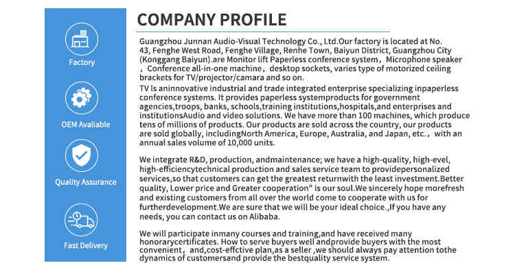 高度な電動OLEDスクリーンLCDモニターリフターモニターはあらゆる種類のシーンに適しています。CNC機械切断技術とレーザー技術、最新の会議テーブルLCDスクリーンリフターテクノロジーを備えており、製品が超高水準であることを保証します。当社のOLEDスクリーンLCDモニターリフターはすべて中国製で、卸売購入が可能で、顧客向けにプライベートにカスタマイズでき、十分な電動タッチスクリーンLCDモニターリフターの在庫があり、顧客への迅速な配達をサポートします。そして、当社のjunnan機器はCCC、CE認証、ROHS、ISO認証などのさまざまな認証認証を取得しており、製品は安全で高品質で、輸出資格があり、有利な価格の直接工場であり、独自の工場を持ち、長年運営されています。